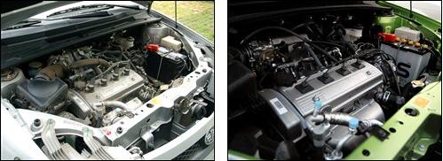 『三廂車型的1.5L發(fā)動(dòng)機(jī)艙(左)和兩廂車型的1.3L發(fā)動(dòng)機(jī)艙』