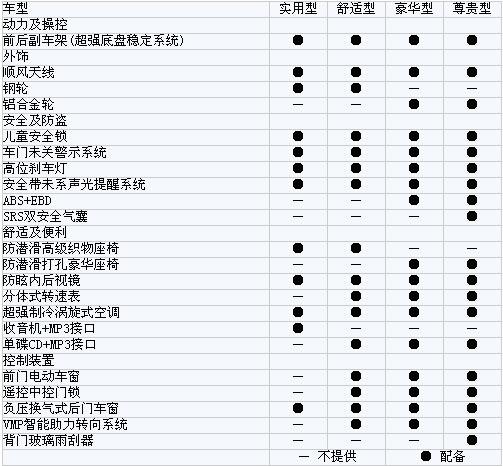 在配置的差異化方面,比亞迪F0(參數(shù)配置 圖庫)實用型不僅沒有配備單碟CD、ABS+EBD、SRS雙安全氣囊等,更沒有分體式轉(zhuǎn)速表。比亞迪F0舒適型在實用型則相應(yīng)主要增加了分體式轉(zhuǎn)速表、單碟CD、前門電動車窗、遙控中控門鎖等配置。同時,比亞迪F0豪華型和尊貴型最大的特點就是配備了ABS+EBD。比亞迪F0尊貴型則更進(jìn)一步擁有了SRS雙安全氣囊。
