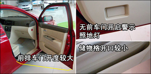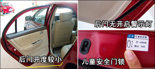 相比前門而言,后門的開度較小,身材高大的人上下車會覺得有一定的方便。撥桿式兒童安全門鎖操作容易,設計有醒目的使用提示標簽。