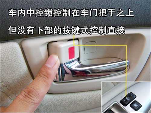 車門內(nèi)一角沒有中控鎖提拉控制桿,駕駛員側車門控制臺設計有控制按鍵。設計有時速20公里行車自動落鎖功能,日常駕駛時顯得十分方便。