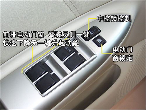 駕駛員側車門控制區(qū)僅有全車門窗控制,以及車內(nèi)中控鎖控制,而其它常見功能調(diào)節(jié)控制均在駕駛席左側。全車車窗僅駕駛員一側為“一觸式”下降,無“防夾”功能。