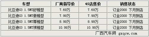 10月26日,比亞迪汽車首款中級車G3正式在國內(nèi)上市,售價(jià)7.69-10.99萬元。比亞迪G3是比亞迪汽車A3銷售網(wǎng)絡(luò)和G系產(chǎn)品的首款車型,標(biāo)志著比亞迪汽車開啟了全新的產(chǎn)品時(shí)代,走向高端化發(fā)展路線。本站了解到,目前比亞迪各家經(jīng)銷商處還沒有G3現(xiàn)車銷售,僅提供預(yù)訂,訂金2000元,最快將在下個(gè)月到店。詳情如下: