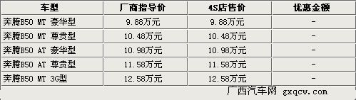 作為一汽奔騰全新家用轎車,與馬自達(dá)6同一平臺的奔騰B50,搭載速騰1.6L引擎。推出市場以后,奔騰B50憑借優(yōu)秀的外形設(shè)計(jì)和過硬的品質(zhì),受到很多消費(fèi)者的喜愛。編輯了解到目前南寧市的經(jīng)銷商處奔騰B50現(xiàn)車顏色不全,購車仍無任何優(yōu)惠。詳情如下: