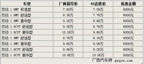 銷售人員表示,現(xiàn)在店內(nèi)的歡動車型較齊全,全系車型均可享受6000元的現(xiàn)金優(yōu)惠,同時(shí)還有1000元至2000元的大禮包贈送,同樣超值,但不可折換現(xiàn)金。