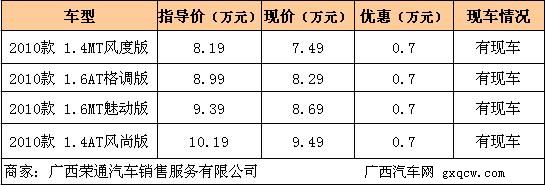 近日,筆者在廣西榮通汽車銷售服務(wù)有限公司了解到,樂(lè)風(fēng)2010款現(xiàn)車充足,現(xiàn)在訂購(gòu)可以在原價(jià)基礎(chǔ)上優(yōu)惠7000元現(xiàn)金,并贈(zèng)送裝飾禮包。具體車款詳見(jiàn)下表: