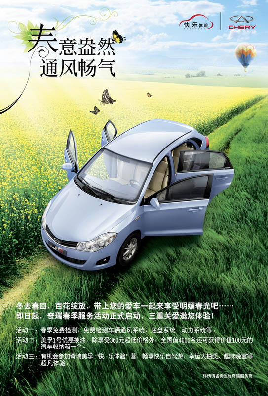 冬去春回,百花綻放,正值萬物復蘇之際,奇瑞公司啟動了2010年“快•樂體驗”服務品牌春季關愛活動。據(jù)悉,此次活動以“春意盎然 通風暢氣”為主題,旨在以服務送清爽,為用戶營造春季清新舒暢的駕車體驗。
