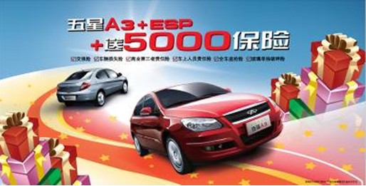 據(jù)了解,由于該活動(dòng)使購買奇瑞A3的消費(fèi)者直接減少5000元的保險(xiǎn)支出費(fèi)用,讓用戶真正享受到了“安全無險(xiǎn)”,因此得到消費(fèi)者的普遍認(rèn)可。直到6月底前,只要購買奇瑞A3 2010款車型即能獲得總價(jià)值5000元的全額購車保險(xiǎn),包括交強(qiáng)險(xiǎn)、車輛損失險(xiǎn)、商業(yè)第三者責(zé)任險(xiǎn)、車上人員責(zé)任險(xiǎn)、全車盜搶險(xiǎn)、玻璃單獨(dú)破碎險(xiǎn)在內(nèi)的6項(xiàng)內(nèi)容。