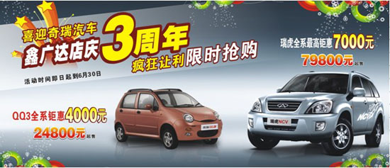 即日起到6月底,為慶祝廣西鑫廣達(dá)奇瑞店慶3周年,QQ3全系鉅惠4000元,24800元起售,又一次刷新了中國(guó)小車的低價(jià)記錄,瘋狂搶購(gòu)正式開(kāi)始了!