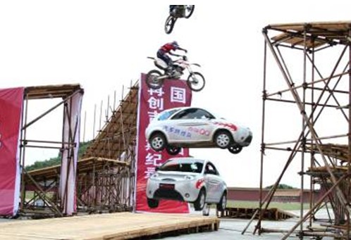 2010年,奇瑞QQ成功創(chuàng)造了“四車交叉飛躍”吉尼斯世界紀錄,這是繼去年成功挑戰(zhàn)“汽車漂移入位前后最窄距離”世界紀錄之后,第二次成功挑戰(zhàn)吉尼斯。奇瑞QQ經(jīng)得住特技表演中摸爬滾打的高難度考驗,充分說明了QQ作為中國小車的世界品質(zhì)。