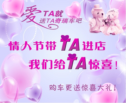 浪漫的情人節(jié),買輛喜愛的奇瑞轎車,送給最心愛的TA,這是一件多么浪漫的事情。當(dāng)老的時(shí)候,回頭想想,這必是一個(gè)永久地刻骨銘心的情人節(jié)。