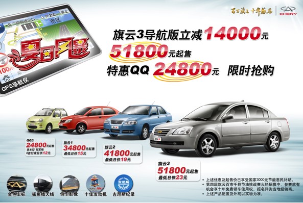 “夏日風(fēng)暴”促銷(xiāo)活動(dòng)與其他汽車(chē)廠家花樣繁多的促銷(xiāo)手段不同,更注重消費(fèi)者關(guān)心的價(jià)格方面實(shí)實(shí)在在的優(yōu)惠,本次活動(dòng)優(yōu)惠幅度最大的是在現(xiàn)有旗云3車(chē)型上增配GPS導(dǎo)航儀、倒車(chē)影像、多媒體影音娛樂(lè)系統(tǒng)的旗云3導(dǎo)航版,起售價(jià)僅為51800元,優(yōu)惠幅度近14000元,最低日供僅為23元。