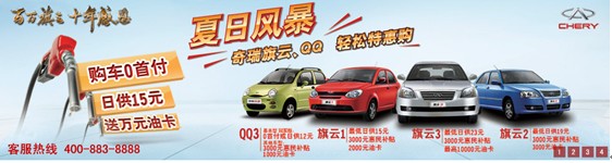 記者走訪奇瑞4S店了解到,本次“夏日風(fēng)暴”由“立減”、“貸款”兩大活動組成,是奇瑞公司在盛夏酷暑之際為廣大消費(fèi)者送出的一份“消暑大禮”,旨在回饋消費(fèi)者長期以來對旗云、QQ系列產(chǎn)品的支持與厚愛。其中,“立減”是指,購買旗云導(dǎo)航版,立即減免14000元,奇瑞QQ 24800元限時(shí)特惠搶購;參加“貸款活動”的消費(fèi)者通過貸款購買QQ3、旗云則可享受0元首付、日供15元、價(jià)值萬元的加油卡優(yōu)惠。