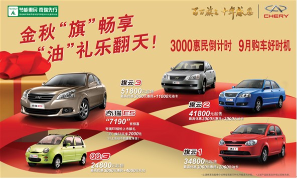 濃情9月,為感謝廣大用戶對(duì)奇瑞汽車的長(zhǎng)期關(guān)注與支持,奇瑞旗云事業(yè)部攜手旗下系、東方之子等經(jīng)典節(jié)能車型,邀您共載節(jié)能惠民“末班車”。