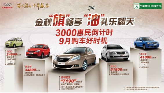 3000惠民倒計(jì)時 九月購車好時機(jī)。記者從奇瑞汽車得到消息,旗云現(xiàn)有的“金秋‘旗’暢享,‘油’禮樂翻天”大型促銷活動也將于9月30日結(jié)束。對于有意旗云的消費(fèi)者而言,9月剩下的這些天,將是他們最后,也是最好的購車時機(jī)。在此次促銷活動中,根據(jù)旗云1、2、3三款車型和各自面對的消費(fèi)者有針對性的分別推出不同幅度的優(yōu)惠套餐:旗云全系均享受3000元節(jié)能補(bǔ)貼,同時,根據(jù)不同車型,購車還將贈送2000—11000元不等的油卡,多重優(yōu)惠出擊,在涼風(fēng)習(xí)習(xí)的金秋時節(jié),盡情彰顯旗云汽車的親民本色。