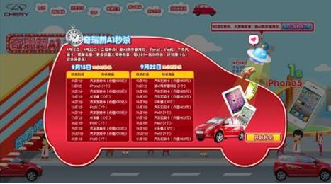 網(wǎng)絡(luò)日漸興起的秒殺正成為網(wǎng)民狂歡的節(jié)日,奇瑞新A1則提出12小時連環(huán)秒殺的活動機(jī)制,更在9月15日和9月22日舉行兩天,每天12次秒殺機(jī)會無疑能挑動你的神經(jīng)。秒殺的獎品包含A1車模、千元汽油卡、iPad2,更有iPhone5和奇瑞新A1兩年使用權(quán)兩個終極大獎。只要你點(diǎn)擊鼠標(biāo)的速度夠快,大獎就可以輕松拿到。兩天的12小時不間斷“極限秒殺”,每天連續(xù)12次的秒殺機(jī)會挑戰(zhàn)網(wǎng)友關(guān)注極限,奇瑞旨在打造一場與消費(fèi)者共享的秒殺盛典。