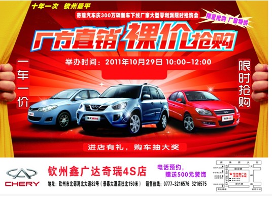 為慶祝奇瑞汽車300萬輛下線,回饋各界愛車人士的支持,欽州鑫廣達(dá)旗瑞店將于10月29日開展‘百萬讓利,廠家裸價(jià)直銷’限時(shí)搶購直銷會(huì)。此次直銷會(huì)將會(huì)成為廠家和經(jīng)銷商底價(jià)促銷的最大行動(dòng),十年一次,全市最便。趕緊訂購吧!