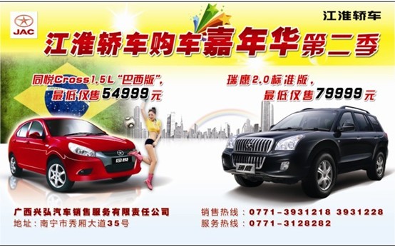 廣西興弘“江淮轎車購車嘉年華第二季”活動(dòng)將于10月29日舉行,特推出活動(dòng)火爆價(jià):同悅Cross1.5L“巴西版”最低僅售54999元;瑞鷹2.0L標(biāo)準(zhǔn)版最低僅售79999元;老客戶轉(zhuǎn)介還有精美禮品。來店禮,試駕禮,訂車禮,購車禮,好禮不斷。詳情請(qǐng)垂詢廣西興弘江淮4S店0771-3931218 3931228 南寧市秀廂大道35號(hào)