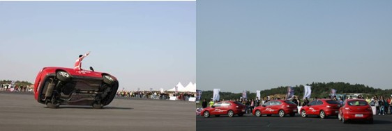 在挑戰(zhàn)賽開始前,由多次征戰(zhàn)中國汽車拉力錦標賽(CRC)的賽車手駕駛A3進行的特技表演秀首先上演,只見4輛A3首先以繞場自由行駛一圈的形式亮相全場。而后迅速排成首尾銜接的一列,組成了一條長長的車龍在場地中穿行游走。在完成了多趟蛇形穿樁之后,4輛A3又分成兩兩一組,在場內(nèi)玩起更加驚險的交叉蛇形穿樁表演。最后,隨著觀眾的掌聲,伴著主持人的解說,車隊在場地內(nèi)展示了難得一見的汽車“單邊飛行”特技表演,將本次表演推向高潮。一時間場地內(nèi)人頭攢動,現(xiàn)場人氣不斷高漲,賽車轟鳴聲與人群吶喊聲在室外的露天廣場上此起彼伏。