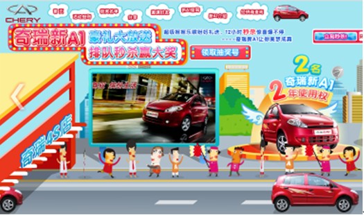 據(jù)了解,此次活動包括兩部分,一是9月8日至10月20日的搖搖樂活動,二是9月14日和9月22日的秒殺活動。在搖搖樂活動中,消費者填寫個人信息后即可參與虛擬排隊活動, 800個30元中國移動充值卡、60個奇瑞A1車模以及1輛奇瑞新A1兩年使用權(quán)引發(fā)網(wǎng)友追捧。最終,吸引了超過7萬人次參與。