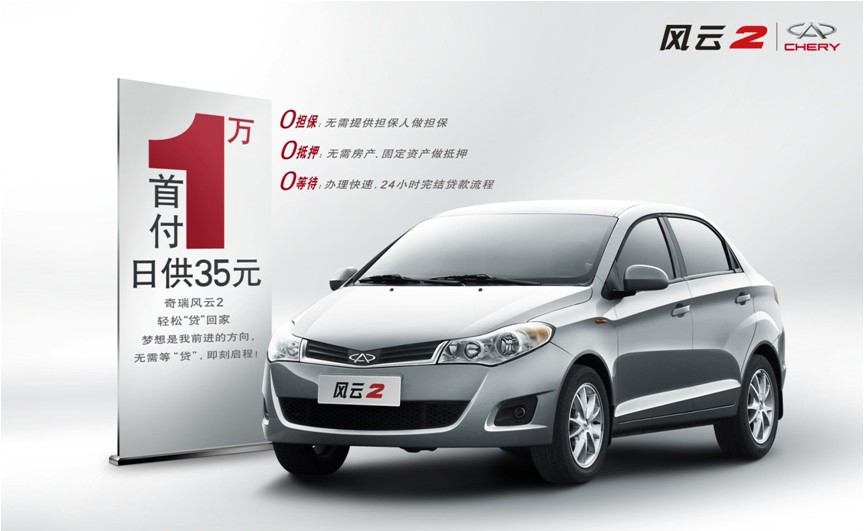 奇瑞風(fēng)云2在9月份推出了“首付1萬 日供35元”的車貸活動,詳細內(nèi)容如下:購買風(fēng)云2進取型,您只需支付1萬元首付,貸款5年,無需提供擔(dān)保人做擔(dān)保、無需房產(chǎn)或固定資產(chǎn)抵押,并在以后5年內(nèi),以每天35元還清余款即可。另外加上購置稅3577元、上牌費用300元、車船使用稅480元、交強險950元,常規(guī)保險3265元,共計18572元,僅相當(dāng)于半年的打車費用。這樣不僅大大降低了一次性支出費用,也為那些手頭流動資金不是很充足的用戶提供了周轉(zhuǎn)的便利。