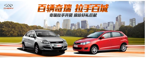 團購!6折!秒殺!搶購狂潮,風云再起!奇瑞汽車日前正式聯(lián)手國內(nèi)最大團購網(wǎng)站拉手網(wǎng),震撼推出 “百輛奇瑞 拉手百城”的網(wǎng)絡(luò)搶購活動。只要你是“網(wǎng)絡(luò)購物狂人”,只要你是“鼠標達人”,只要你是“秒殺控”,均可在2011年10月25日至2012年1月10日期間,登陸活動頁面www.lashou.com/event/chery.php,盡享史無前例的網(wǎng)絡(luò)購車盛宴。