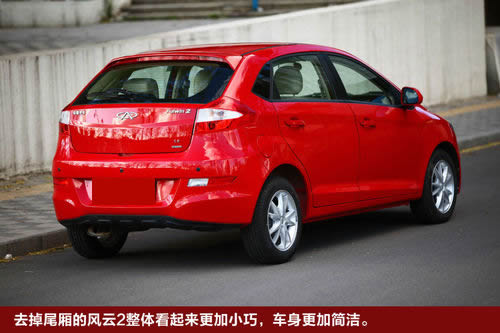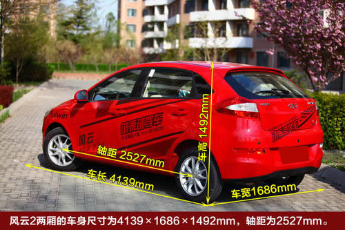 風云2兩廂的車身尺寸為4139mm/1686mm/1492mm,比三廂風云2的4269mm/1686mm/1492mm的三圍僅僅在長度上短了130mm,寬度、高度以及2527mm的軸距則保持相同。