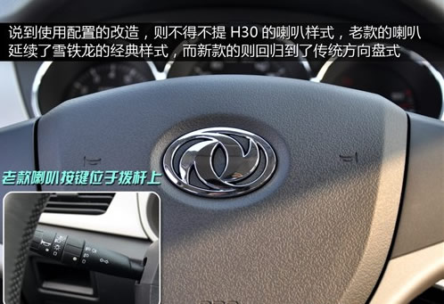 2012款H30中控方面的另一變化重點(diǎn)就是方向盤的造型,老款的方向盤樣式與標(biāo)致車型的樣式十分相似,而新款方向盤的造型則更具體有立體感和運(yùn)動(dòng)感,另外在方向盤上還發(fā)現(xiàn)了新款H30變化的一大亮點(diǎn),就是喇叭的位置回歸于傳統(tǒng)樣式,老款置于撥桿上的喇叭按鍵需要相當(dāng)長的適應(yīng)時(shí)間,而樣式的“回歸”也是我們樂于看到的變化。