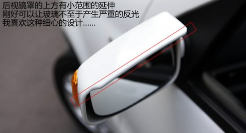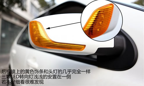 后視鏡上的黃色飾條和頭燈的幾乎完全一樣,三顆LED轉(zhuǎn)向燈淺淺的安置在一側(cè),若不仔細看很難發(fā)現(xiàn)。后視鏡罩的上方有小范圍的延伸,剛好可以讓玻璃不至于產(chǎn)生嚴重的反光,我喜歡這種細心的設(shè)計。