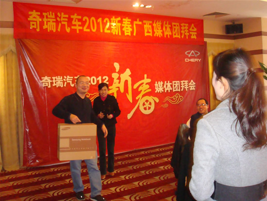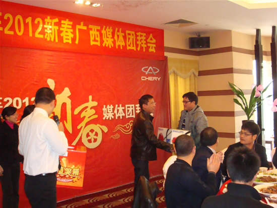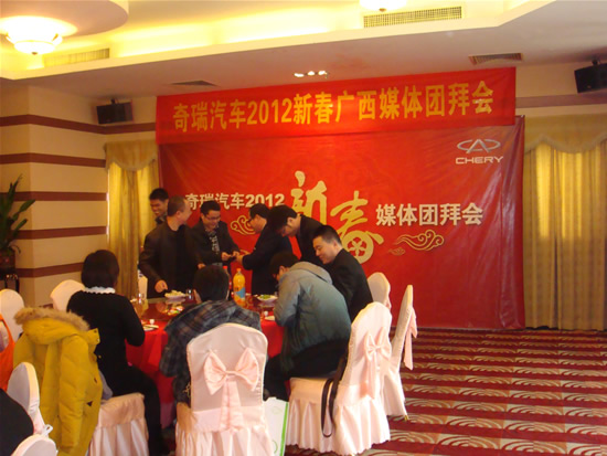 2012年1月9日, 奇瑞汽車2012新春媒體團(tuán)拜會(huì)在南寧舉辦。奇瑞公司領(lǐng)導(dǎo)與各新聞媒體代表歡聚一堂、暢敘友誼、共迎新春。奇瑞公司在表達(dá)對(duì)全國媒體感激之情的同時(shí),回顧了奇瑞汽車在“成長2011”戰(zhàn)略方針指導(dǎo)下所取得的成績并對(duì)未來發(fā)展進(jìn)行了展望。