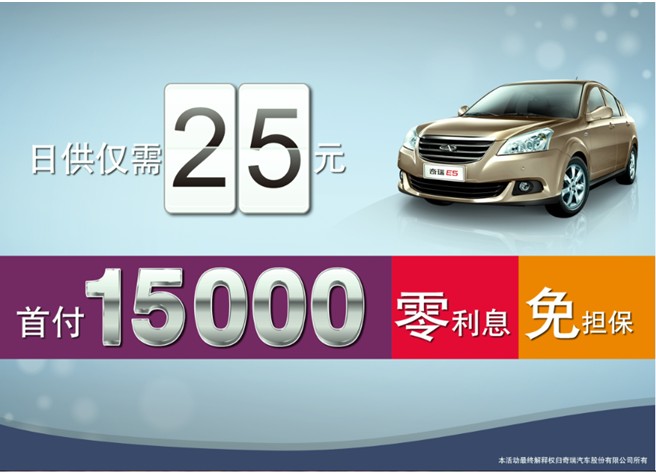 現(xiàn)如今貸款買車已成為一種時尚消費方式,為了能夠讓更多的用戶感受到奇瑞E5帶來的人本科技魅力,旗云銷售公司推出的“0利息,日供25,首付1萬5 奇瑞E5開回家”惠民個貸,無疑于冬季魅禮,讓更多愛車人士早日分享科技易生活。