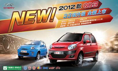 中國汽車市場新年開門巨獻,奇瑞汽車2012強力首推杰作——12款奇瑞QQ,33項升級全新上市。2012款奇瑞QQ,眾多科技薈萃,設(shè)計求新創(chuàng)變,在節(jié)能、動力、外觀等方面,進行了多達33項顛覆性升級,展現(xiàn)出傲視同儕的產(chǎn)品實力。新車型售價3.09~5.09萬元,更能享受3000節(jié)能惠民補貼。