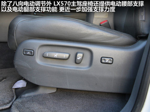 LX570全車均配備了舒適度極強的真皮座椅,座椅內(nèi)部的填充物很軟,乘坐起來舒適度符合雷克薩斯一直以來對舒適的詮釋。主駕座椅除了配備八向電動調(diào)節(jié)外,還提供電動腰部支撐以及電動腿部支撐功能,更進一步加強了座椅的支撐力度。