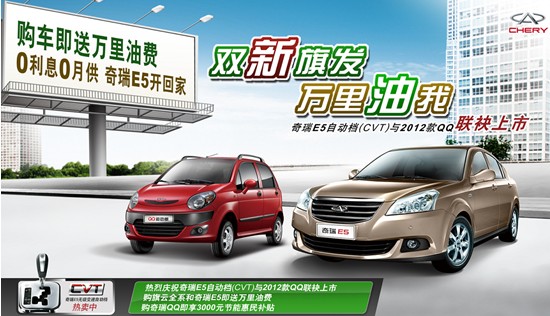 記者從鑫廣達奇瑞4S店了解到,此次推出的“雙‘新’旗發(fā) 萬里‘油’我”活動,是旗云繼新春“‘旗’福萬家,‘云’集豪禮躍龍門”活動后又一巨幅優(yōu)惠,促銷力度空前。整個活動由“購車即送萬里油”、“0利息 0月供 奇瑞E5開回家”等部分組成,從不同角度讓利消費者。