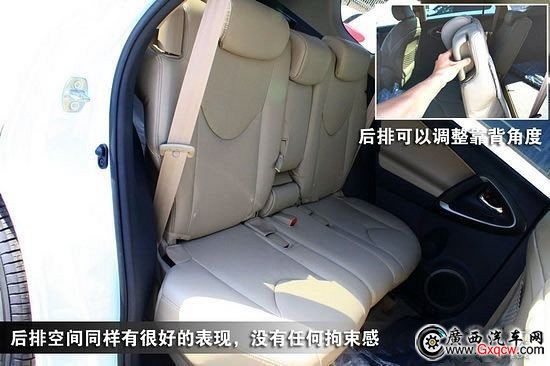 RAV4的前排座椅很舒適,手感也不錯;空間也很充裕,無論是頭部還是腿部都有足夠的余量,基本沒有壓抑的感覺。同時座椅位置偏高,保證了駕駛者有一個比較良好的前方視野。后排空間同樣有很好的表現,沒有任何拘束感,此外后排座椅可以調整靠背角度。