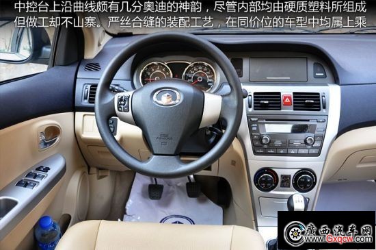 騰翼C30的內(nèi)飾采用簡潔大方的風(fēng)格,中控臺上方留有安裝大屏幕GPS/DVD的空位,與儀表板連成一氣的格局,更有利于提高駕駛員的操作便利性,而門板和中控臺的仍以硬膠作為主要材質(zhì),整體工藝水平接近合資品牌的車型。C30全系標(biāo)配了液壓助力轉(zhuǎn)向、方向盤高低調(diào)節(jié)、中央門鎖、四門電窗、USB接口,可以實現(xiàn)MP3功能,除標(biāo)準(zhǔn)型以外,其它車型均為CD音響。