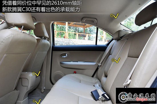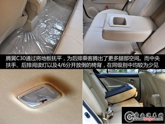 憑借著同價位中罕見的2610mm軸距,2012款騰翼C30還有著出色的承載能力。而設(shè)計方面也絕對勞苦功高,寬厚的座椅不僅柔軟舒適,工程師還通過將地板撫平騰出了更多腿部空間,而中央扶手、后排閱讀燈以及可以4/6分開放倒的椅背,在級別中也較為少見。