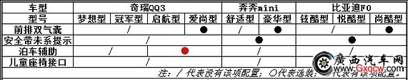 我們對三款車的被動安全配置要求也并不高,不過就算最基本的前排雙安全氣囊對于這些利潤微薄的微型車來說,也顯得有些奢侈。QQ3依舊只有愛尚型配備了前排雙安全氣囊,令人驚訝的是,名氣如此響亮的QQ3竟然全系沒有配備安全帶未系提示功能,相對于氣囊來說,安全帶是更基本也是更重要的安全配置,安全帶未系提示功能這種成本幾乎可以忽略不計的功能完全沒有必要省略。最后,讓我們倍感遺憾的是,這三款銷量如此高的微型車全部沒有配備兒童安全座椅接口,在此我們也奉勸這三款車型的車主們,就讓它們作為你們自己的代步工具吧,千萬不要讓年幼的孩子坐進(jìn)去。令人感嘆的是,QQ3愛尚版竟然配備了泊車輔助(即倒車?yán)走_(dá)),奇瑞的意思很明確,倒車?yán)走_(dá)是都能看到的配置,不過隨著消費者愈來愈成熟,這樣的配置搭配思路也應(yīng)該重新考量一下了。