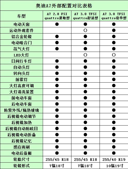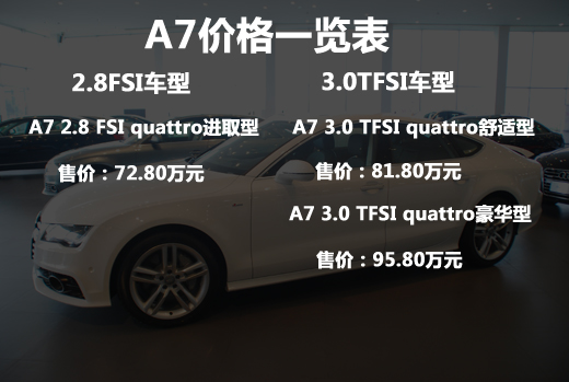 先期引入中國的A7一共有三款車型,分別是售價(jià)72.80萬元的奧迪A7 2.8 FSI quattro進(jìn)取型,售價(jià)81.80萬元的奧迪A7 3.0TFSI quattro舒適型和售價(jià)95.80萬元的奧迪A7 3.0TFSI quattro豪華型。