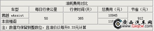 在輕混車型中,以購買一輛君eAassist為例,在為其一年的時(shí)間以平均每天行駛50公里計(jì)算,在一年結(jié)束時(shí)君越eAssist的油耗花費(fèi)為10945元,而相同 排量的雅閣則在油費(fèi)上花費(fèi)了11857元,兩者相差912元。
