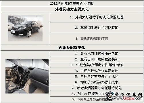 2012款EC7相對(duì)于經(jīng)典款車型,進(jìn)行了多達(dá)30余項(xiàng)的進(jìn)化,最大的亮點(diǎn)就是新增了匹配自主研發(fā)動(dòng)力的1.5L車型,于此同時(shí),外觀和內(nèi)飾進(jìn)行了相應(yīng)運(yùn)動(dòng)時(shí)尚化的改進(jìn),增加了包括電子穩(wěn)定系統(tǒng)及起停系統(tǒng)等高科技人性化配置。