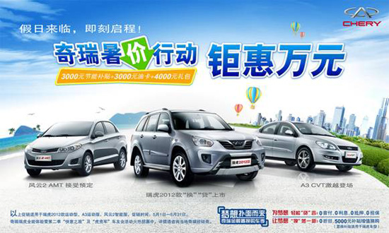 說了半天,得說點實際的了~~~~跟大家說個我剛剛得到的消息,近期瑞虎2012款運動型、風云2智能版、A3運動版將有一個巨大力度的促銷活動,綜合優(yōu)惠10000萬,相信對于很多車主來說這可是個不小的誘惑啊~~~呵呵~~~