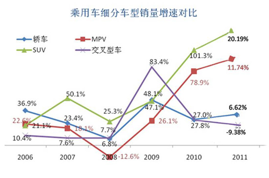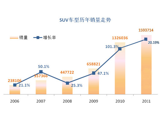 雖然2011年國內(nèi)車市陰云籠罩,整體上升乏力,但SUV市場銷量卻一路走好。六年近10倍的增長速度,讓中級車市場也暗淡無光。無論是合資品牌還是自主品牌,都把SUV看成企業(yè)新的希望,沒人懷疑未來屬于SUV的光明前途。