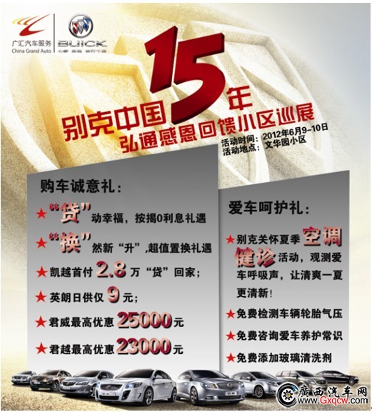 巡展服務(wù)的首站為文華園,歡迎小區(qū)內(nèi)業(yè)主和周邊住宅業(yè)主參加活動(dòng)。另外,為了節(jié)省您寶貴的時(shí)間,參加車輛檢查的別克車主最好提前電話預(yù)約,以便合理地安排時(shí)間。