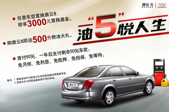 6月購(gòu)買旗云5的客戶如有老車置換(僅限乘用車),可享受3000元專項(xiàng)置換基金,并且可以同時(shí)享受500L燃油大禮;若消費(fèi)者在置換5的基礎(chǔ)上采用金融貸款購(gòu)車方案,可以重復(fù)享受此兩項(xiàng)優(yōu)惠政策,累計(jì)綜合優(yōu)惠近萬(wàn)元。