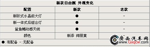 外觀方面,新款自由艦在保持老款原有風格上,細節(jié)部分稍有變化。采用全新全球鷹品牌LOGO,大燈設計更加亮眼,在內(nèi)部轉向燈處位置添加了流行元素-LED光源。尾部設計整體大氣流暢,尾燈由老款的圓燈組改為條形燈組。細節(jié)之處新款自由艦的后鯊魚鰭收音機天線顯得更加飽滿,更能與車身容為一體。