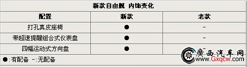 新自由艦在內(nèi)飾方面較之老款相比有所提升。全系標配真皮座椅讓乘坐更為舒適。而新自由艦雙色環(huán)倉內(nèi)飾設計更為時尚,使車內(nèi)的視覺空間更大,室內(nèi)空間更加協(xié)調(diào)。方向盤裝飾歐美流行的鋁拉絲鈦銀飾板,頗具金屬質感。駕駛檔把也經(jīng)過重新設計,更加動感圓潤。
