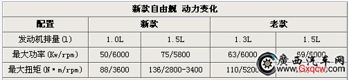 此次新款自由艦最大的變化就是取消了老款的1.3L排量車型,取而代之的是搭載1.0L CVVT發(fā)動機的車型。1.0升車型最大輸出功率為50/6000kw/rpm,峰值扭矩88/3600N·m/rpm。1.5升車型采用1.5升VVT發(fā)動機,最大輸出功率75/5800kw/rpm,峰值扭矩136/2800-3400N·m/rpm。兩款車型的排放均達IV標準。傳動系統(tǒng)上,與這兩種動力配備的均是5速手動變速器。