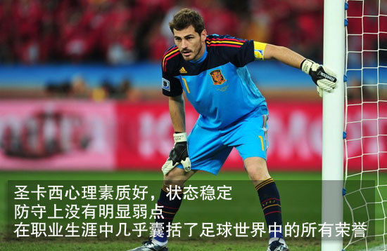 如果要說起現(xiàn)在世界上最優(yōu)秀的門將,卡西利亞斯肯定首當(dāng)其沖。圣卡西同樣效力于皇家馬德里隊,與C羅、厄齊爾同為隊友,他的心理素質(zhì)好,狀態(tài)穩(wěn)定,防守上沒有明顯弱點,在職業(yè)生涯中幾乎囊括了足球世界中的所有榮譽(yù)。這位西班牙隊的隊長在2012歐洲杯半決賽對戰(zhàn)葡萄牙的比賽中,準(zhǔn)確的撲出了穆蒂尼奧和布魯諾.阿爾維斯的點球,幫助西班牙隊?wèi)?zhàn)勝了葡萄牙隊。而在歐洲杯決賽比賽中,正是卡西的優(yōu)秀發(fā)揮保證了球門不失,最終以4:0戰(zhàn)勝了意大利隊。