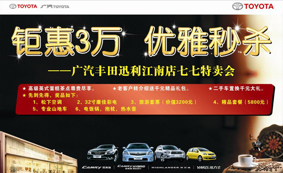 當(dāng)天到迅利江南店訂購凱美瑞將享受最高3萬的優(yōu)惠。訂車更可以參加搶寶活動,現(xiàn)場空調(diào)、液晶電視等大禮,按照訂單先到先得。