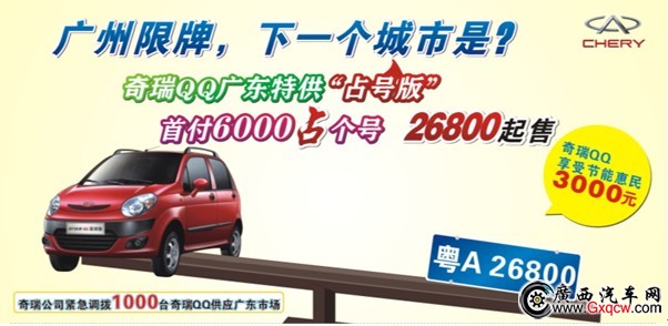 廣州市2012年6月30日晚的一條“限牌”令使廣州市各大車商及眾多計劃買車的廣州市民措手不及,在6月30日晚限購前夜的最后3個小時內(nèi),奇瑞廣州3家4S店部分庫存均被急于開票占號的消費者搶購一空,很多客戶由于經(jīng)銷商購車發(fā)票已經(jīng)開完未能如愿購車占號。被瘋搶的車型主要是奇瑞當家花旦QQ,還有目前在全國熱銷的奇瑞E5。面對突如其來的限購“限牌”令,奇瑞公司緊急調(diào)撥1000臺QQ、E5支援廣東,迅速啟動廣東占號行動,專為廣東市場推出“占號版”車型。